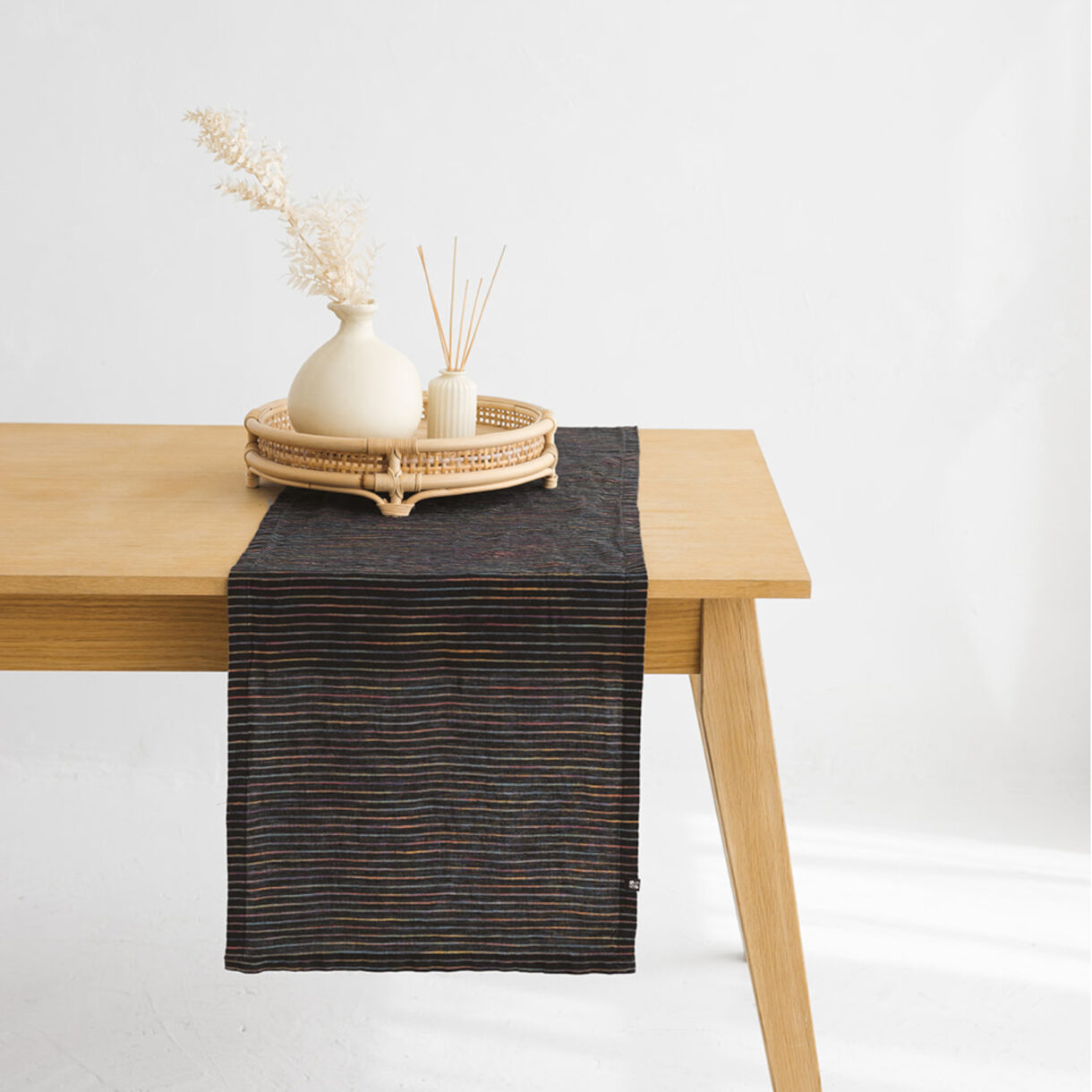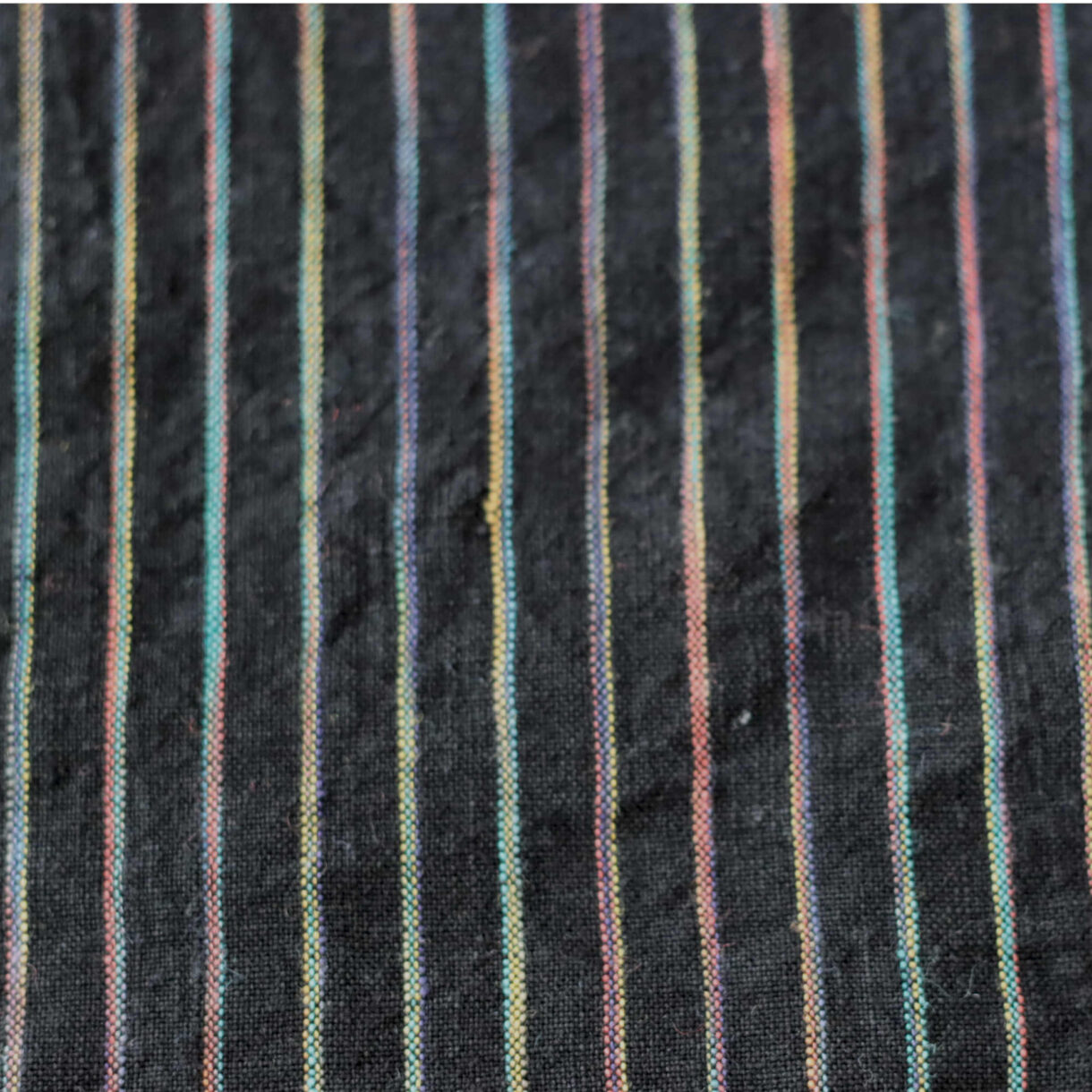 The Midnight Rainbow Stripes linen fabric showcases vibrant, space-dyed rainbow stripes across a deep black background, creating a stunning contrast that balances playfulness with sophistication. The space-dyeing process gives each stripe a varied, multicolor texture—meaning no two pieces are exactly alike, making every creation unique.
